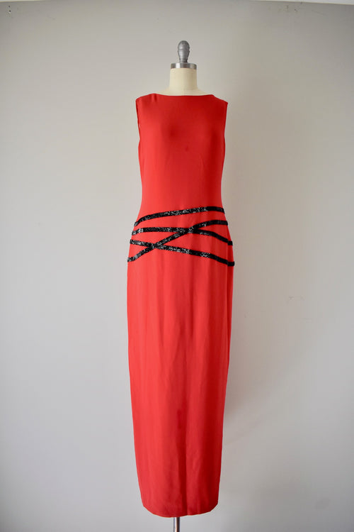Halston Red Crepe Embroidered Dress, ca. 1990